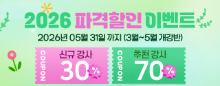 전 과정 수강신청 시 신규강사 30% 할인 / 추천강사 70% 할인 적용 가능!!