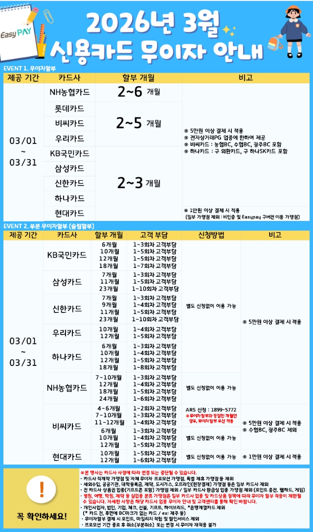 [공지] 2026년 3월 카드사 무이자 할부 이벤트 안내
